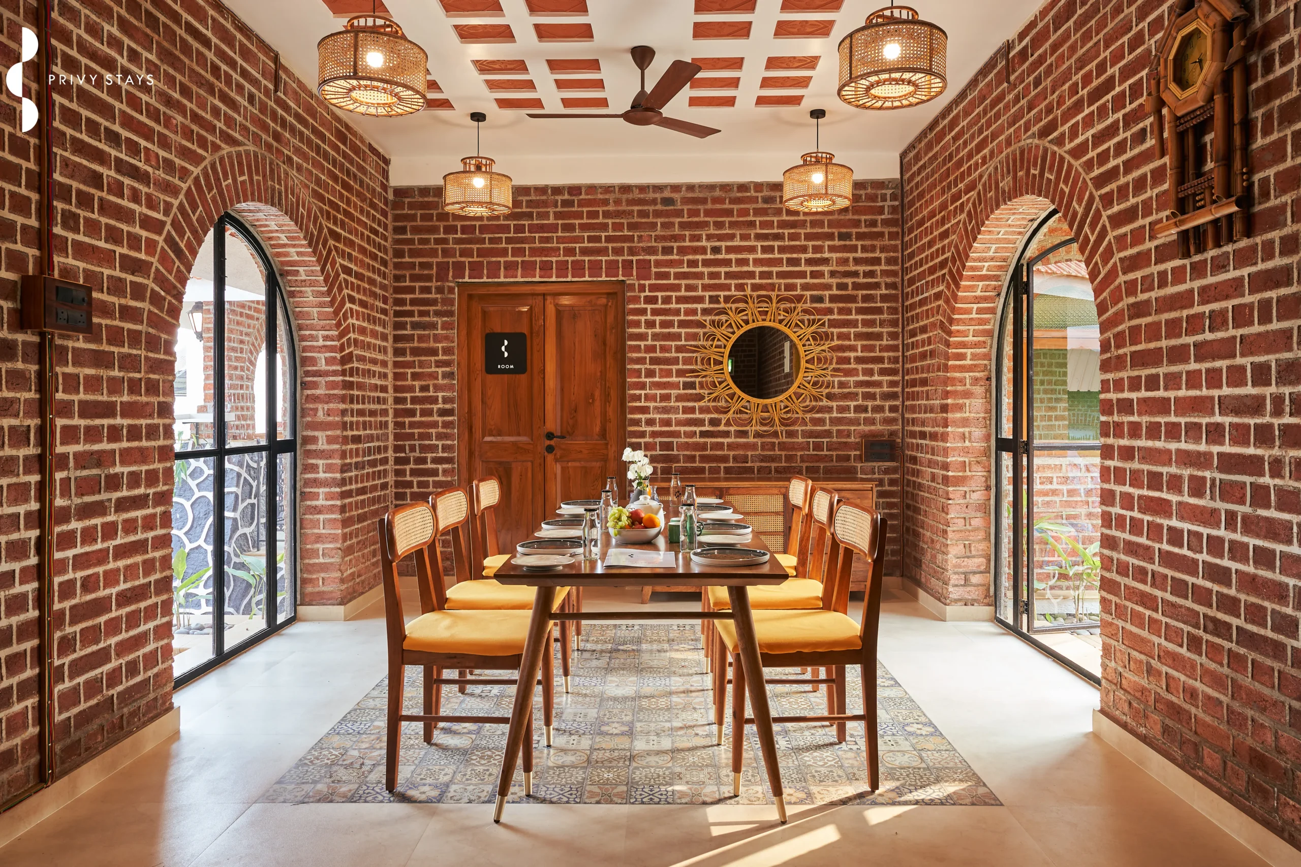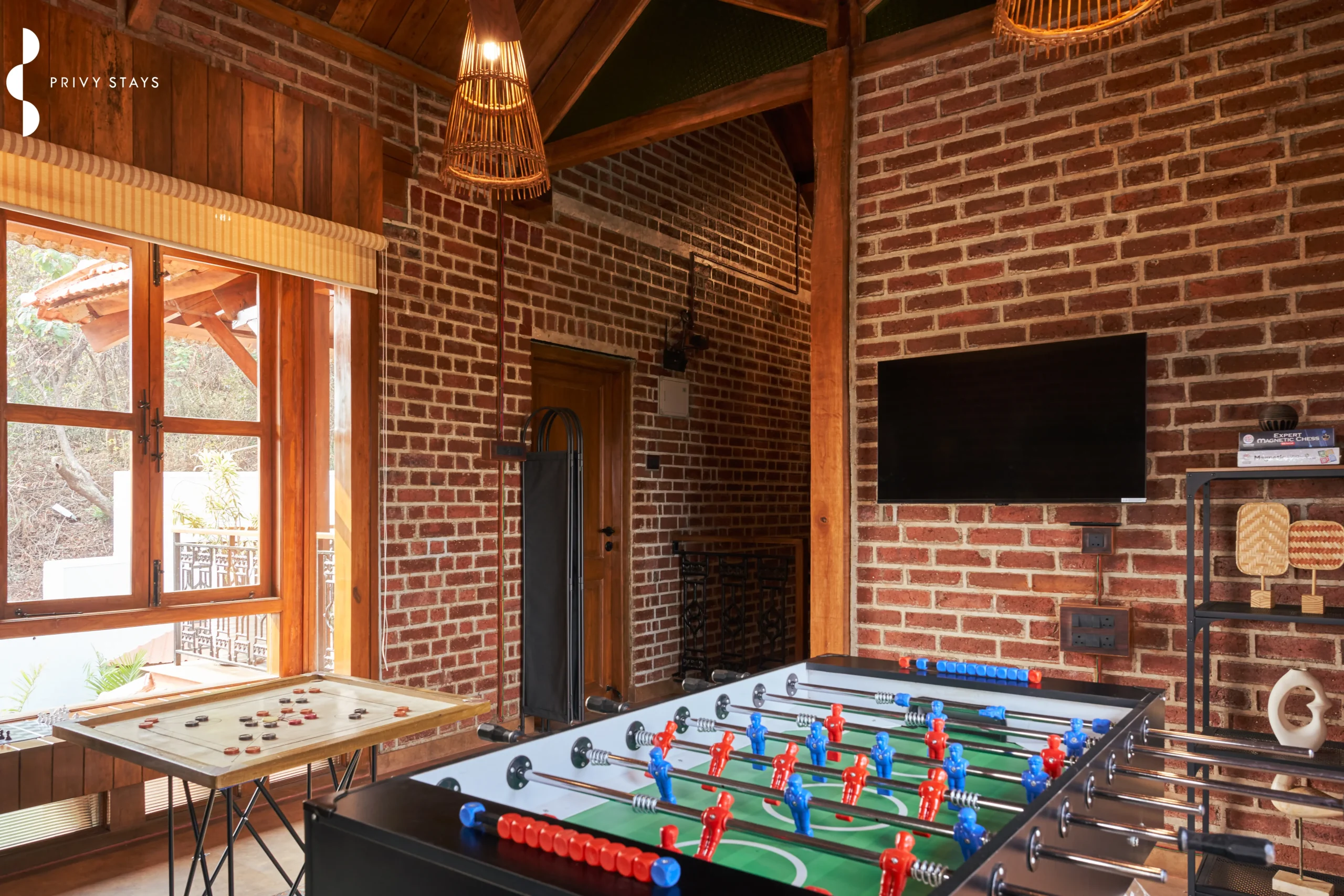 Story By The River stands out among villas in Karjat for family stays thanks to its distinctive rustic brick façade and beautifully crafted wooden interiors. The design celebrates simplicity and warmth while offering a refined luxury stay experience.